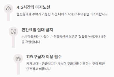 - 119 구급차 이용: 자차보다는 응급처치가 가능한 구급차를 이용하는 것이 훨씬 안전하고 빠릅니다.