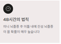 - 48시간의 법칙: 지침에 따르면 미니 뇌졸중 후 이틀 내에 진성 뇌졸중이 올 확률이 매우 높습니다.
