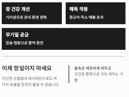 이제 청각을 마트에서 발견하더라도 망설이지 마세요. 간단한 손질법과 초간단 레시피만으로도 여러분은 바다의 보물을 온전히 즐길 수 있습니다. 청각을 통해 몸속은 깨끗하게 비우고, 건강한 활력으로 가득 채우는 기쁨을 누리시기를 바랍니다.